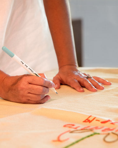 The Memories Tablecloth includes pens specially chosen for this fabric. If the tablecloth is washed before the names are stitched, the ink will disappear — allowing for clean embroidery. Other permanent markers may not wash away and could remain visible behind the stitching.